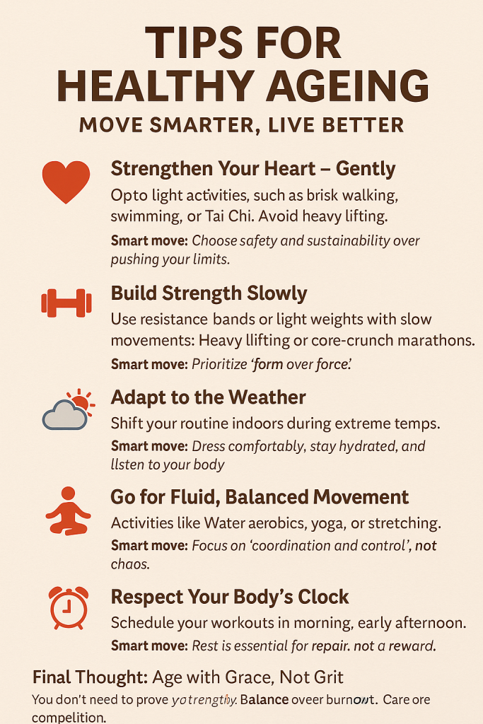 Healthy ageing isn’t about proving strength or chasing intensity. It’s about embracing your body’s rhythm, making intentional choices, and honouring what you need — not what you used to do. Balance over burnout. Care over competition. Active Ageing means moving smarter, breathing deeper, and living better — every single day. Remeber staying active can help you unlock a real treasure which is natures own pharmcy .i.e your body. Cheers !!